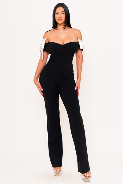 This off-the-shoulder jumpsuit features a stylish color contrast design with a delicate bow on the side arm, adding a chic touch to its pleated front detail. The wide-leg cut ensures comfort and elegance, while the back zipper with hook and eye closure provides a secure fit. Made from a blend of polyester and spandex, it offers moderate stretch for ease of movement. Lined for smooth wear, this piece combines sophistication with functionality, perfect for making a refined statement. The model is 5'8" and wears a size small.