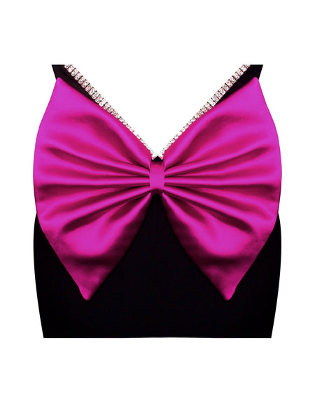 Introducing the breathtaking Flore Black Crystal Straps Backless Gown with Bow. This mesmerizing column silhouette gown is a showstopper, featuring a hot pink satin bow at the back waist for a touch of glamour. Adorned with crystal straps and embellishments along the straight neckline edge and low back waist, the gown exudes sophistication. Designed for both style and comfort, it includes a small slit at the bottom back for ease of movement. Crafted from woven stretch crepe, fully lined, and equipped with an invisible zipper at the side seam under the arm, this gown ensures a seamless fit. Perfect for any special celebration and available exclusively in black!