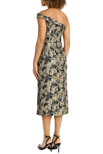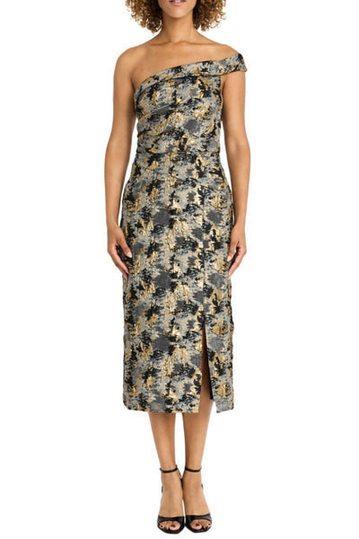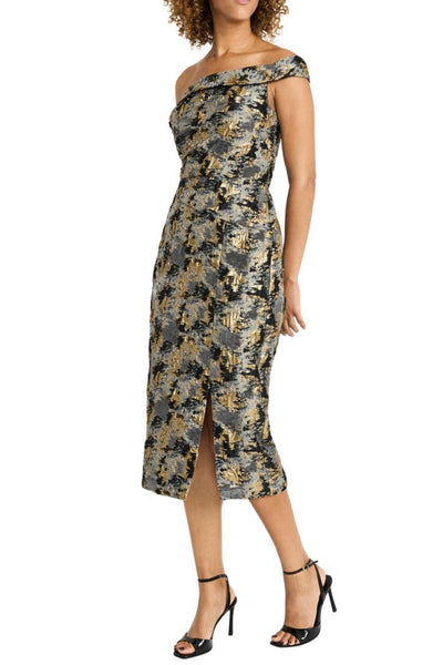 Elevate your wardrobe with this striking Jacquard metallic dress, featuring a captivating multi-color print that catches the light beautifully. The off-shoulder neckline adds contemporary sophistication, while the front skirt slit provides movement and modern appeal. Designed with a full lining and discreet side zipper for effortless wear, this piece transitions seamlessly from evening events to upscale occasions. The structured Jacquard fabric ensures a polished silhouette that commands attention.