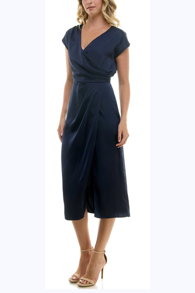 Every woman needs that one midi dress in their closet that can be dressed up and down, and worn throughout the year when it comes to attending dinner and cocktail parties, holiday and birthday celebrations, and that occasional wedding. This stunning faux wrap dress features a surplice V-cut neckline, cap sleeves, pleated detail, and a below-the-knee, front slit, mid-length skirt.