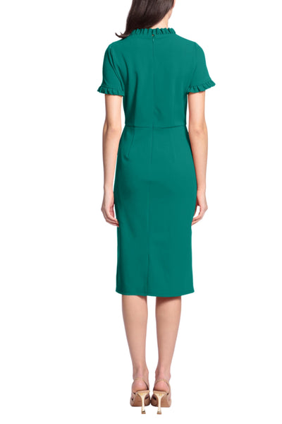 A modest and classic cocktail dress that features a sheath silhouette, a crew neck and short sleeves with pintucked ruffles, two open-front large side pockets, along with a pencil-style, knee-length skirt that can be worn year-round, both during the day and night, and to an array of events such as the workplace, dinner parties, church, holiday celebrations, luncheons, and Sunday brunches.