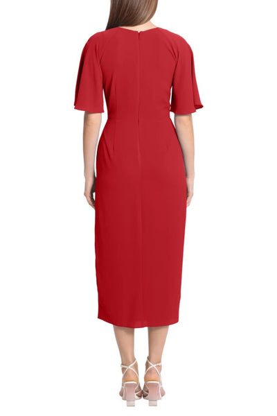 A stylish and flattering midi dress that pairs well with a pump or strappy heel, and it features a textured fabric, short flutter sleeves, a surplice V-neckline, front pleated detail, and a draped-style, mid-length skirt that can be worn year-round to events such as cocktail parties, dinner engagements, birthday parties, and holiday celebrations.
