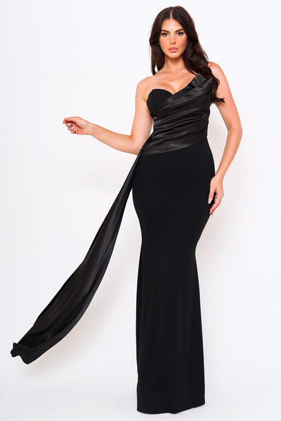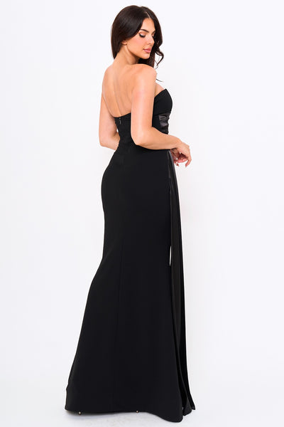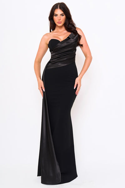 Elevate your evening with this sophisticated mermaid maxi dress, featuring a sweetheart neckline and striking satin contrast detailing across the pleated bust. The dramatic side flare trail adds movement and elegance, while the secure zipper back with hook-and-eye closure ensures a polished fit. Crafted from a polyester-spandex blend with moderate stretch, this dress offers both comfort and structure. The 5'8" model wears a Small. Perfect for formal occasions and special events.