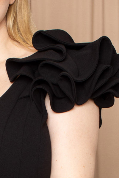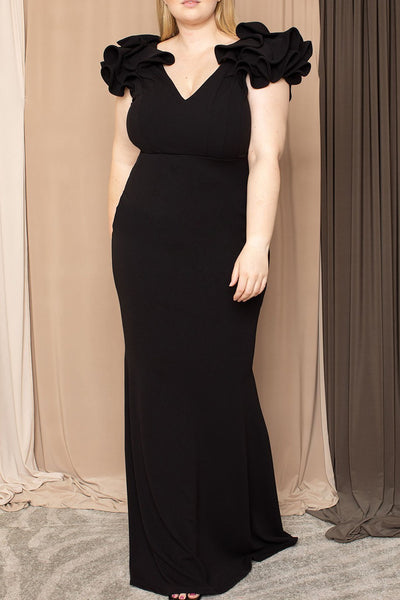 Elevate your evening wardrobe with this sophisticated techno crepe mermaid maxi dress. The flattering V-neckline pairs beautifully with dramatic triple-layer ruffled sleeves that command attention. A sleek back zipper ensures an effortless fit, while the mermaid silhouette creates an elegant, elongated line. Crafted from a premium polyester-spandex blend with a polyester lining, this dress offers both structure and subtle stretch for all-day comfort. Perfect for formal events and special occasions.